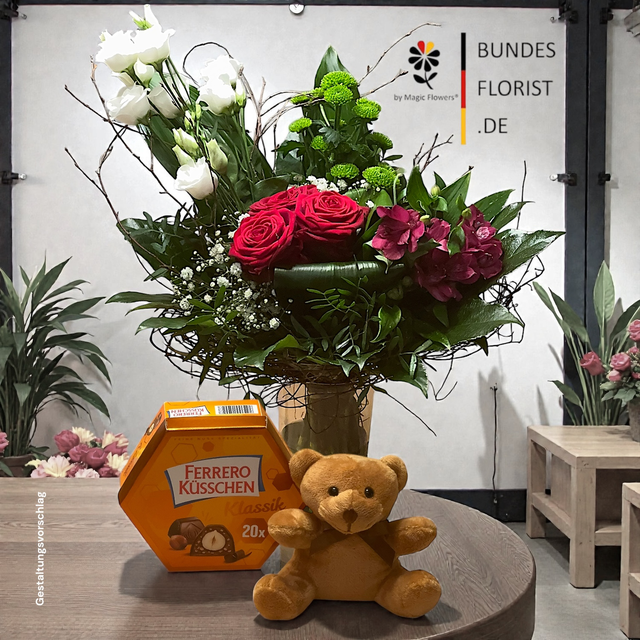 Unser Blumenstrauß "Romantische Liebe" besteht aus roten Rosen, Santini, Schleierkraut, Alstromeria, Eustoma, Grün und Bast.